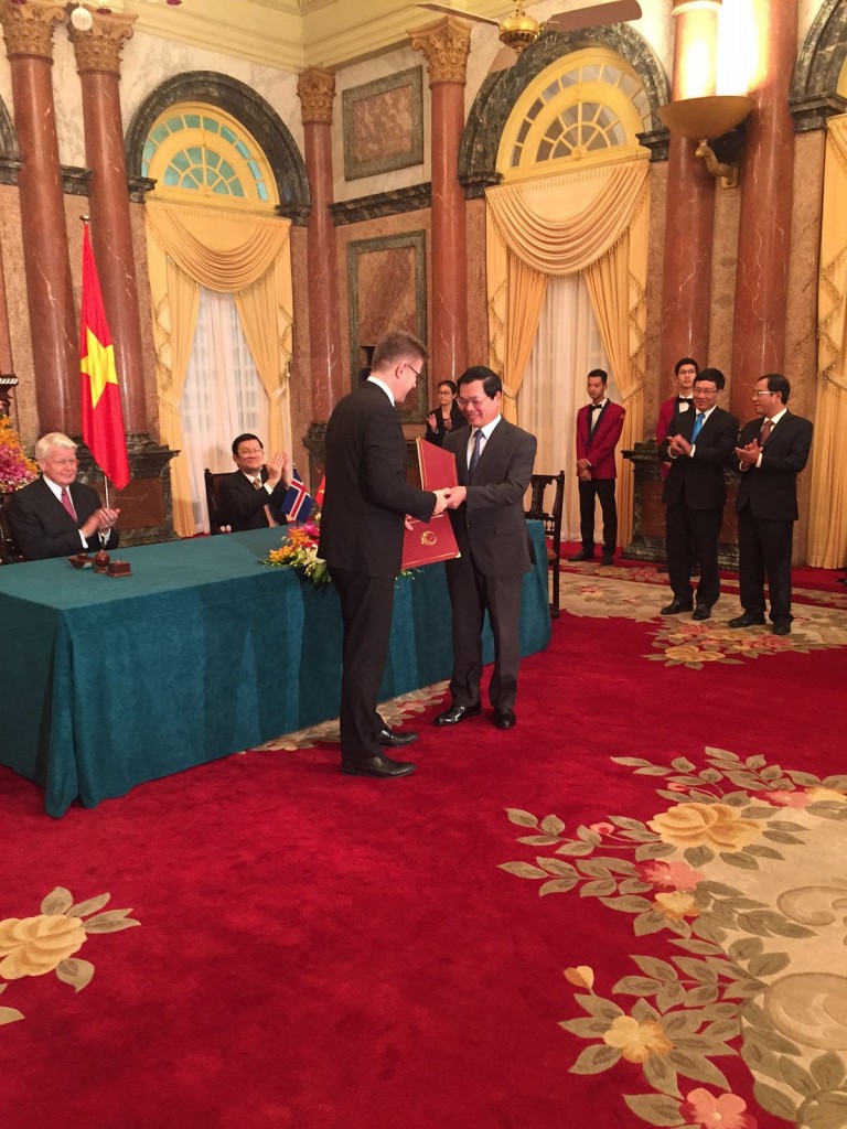 Según el Ministerio de Relaciones Exteriores de Islandia, Gunnar Bragi Sveinsson, Ministro de Relaciones Exteriores se reunió con su homólogo Pham Binh Minh, Secretario de Vietnam la semana pasada en Vietnam. La reunión se realizó en conjunto con la visita oficial del Presidente de Islandia al país. Los ministros debatieron la posibilidad de fortalecer los vínculos comerciales entre ambas naciones y desarrollar políticas conjuntas.