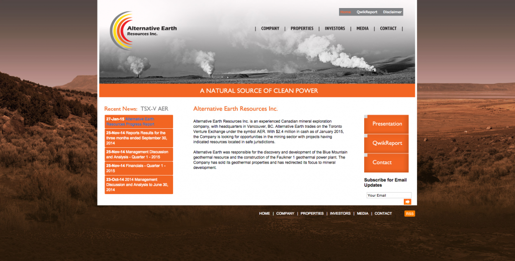 Alternative Earth Resources Inc. ha presentado los últimos detalles de su transición de la energía geotérmica hacia el desarrollo de los recursos minerales. La Compañía cuenta con dinero en efectivo o equivalentes de efectivo de aproximadamente C $ 2,4 millones como resultado de traspasar todos sus antiguos activos en el campo geotérmico.
