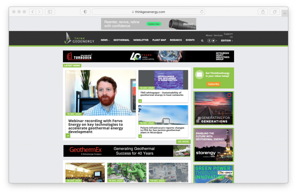 Fundada en 2008, ThinkGeoEnergy se ha establecido como la principal fuente de noticias geotérmicas y la fuente más respetada de información sobre el desarrollo global de la energía geotérmica. Particularmente en los últimos 10 meses, la naturaleza virtual de las cosas, claramente ha aumentado la necesidad de noticias y visibilidad virtuales.