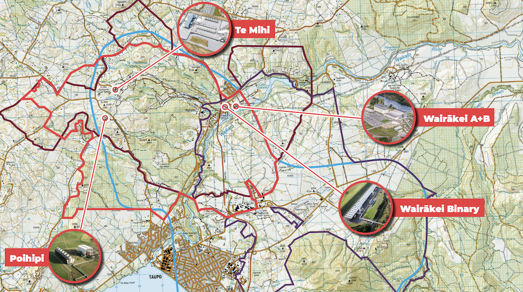 En el campo geotérmico de Wairakei, Contact Energy tiene cuatro plantas de energía geotérmica, las estaciones Wairakei A y B con una capacidad de generación de energía combinada de 125 MW en operación desde 1958 (informamos al respecto). La estación Binary de 15 MW agregados en 2005, la planta geotérmica Poihipi con 50 MW agregados en 1997 y la planta geotérmica Te Mihi de 166 MW que inició operaciones en 2014.