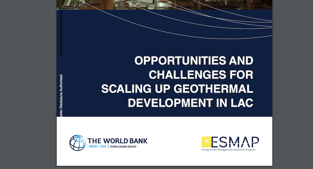 El Banco Mundial ha publicado un excelente informe acerca de las oportunidades y desafíos para impulsar el desarrollo geotérmico en América Latina & Región del Caribe. Entrega una excelente revisión acerca del estado de la utilización geotérmica y de los proyectos en desarrollo, como también de los incentivos disponibles y regulación/regímenes.