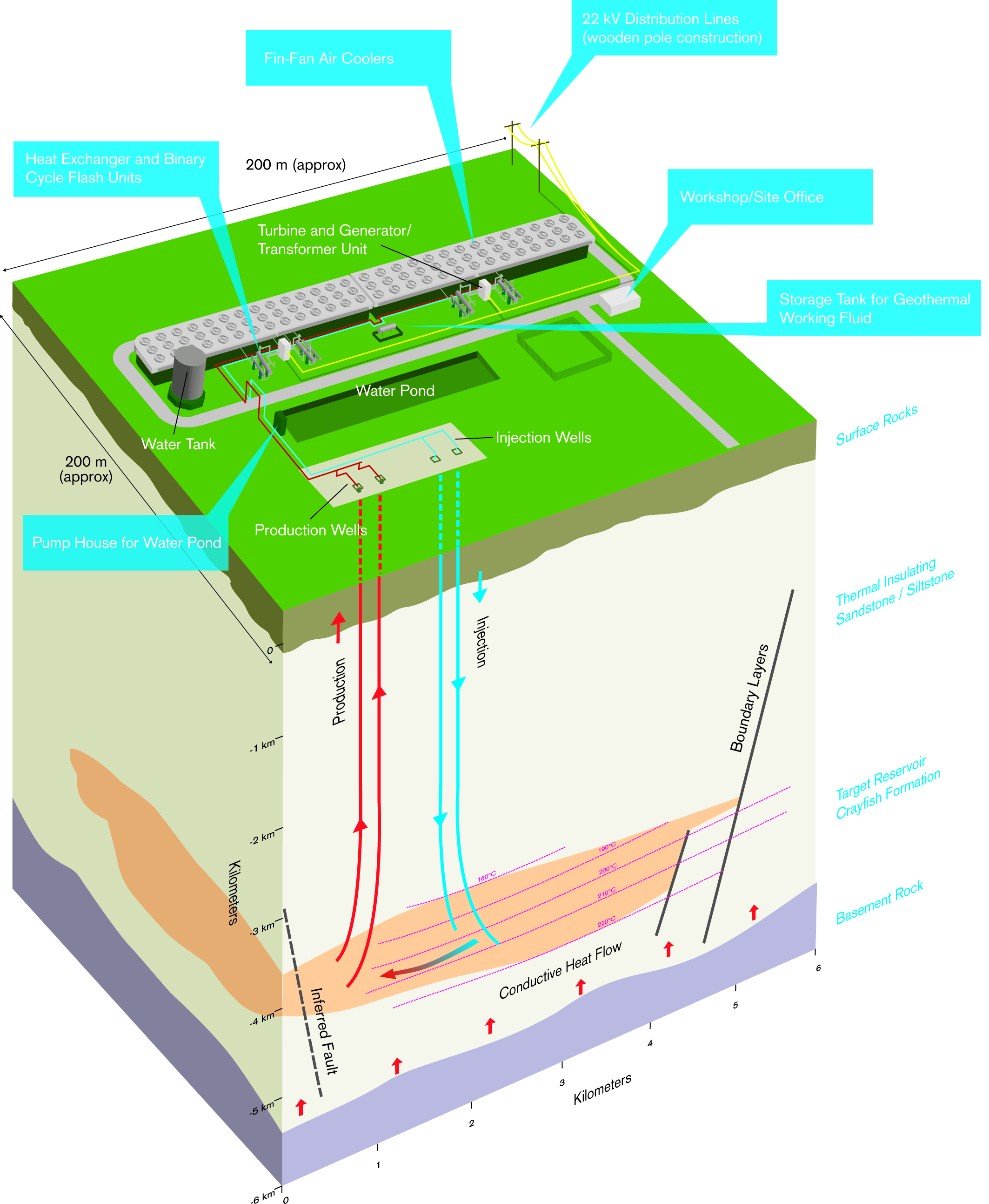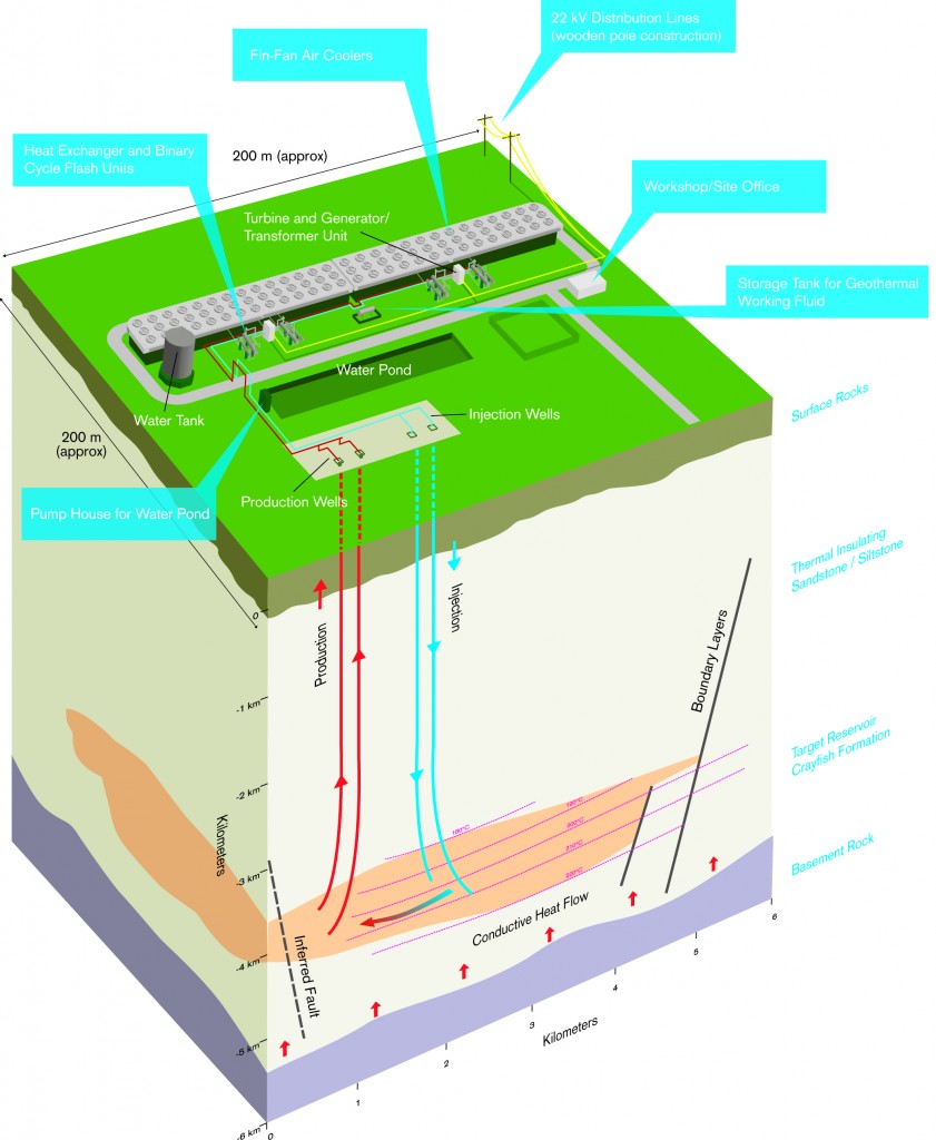 Geelong Geothermal Power Project Conceptual Model (including 12MWe geothermal energy plant – not to scale) (source: Greenearth Energy)
