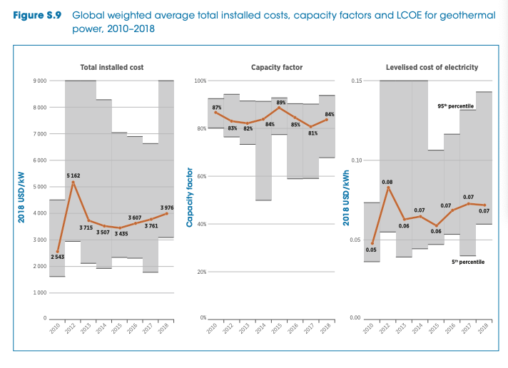 Para la geotermia, IRENA apunta a la debilidad del análisis de datos debido a la cantidad limitada de MW añadidos en la mayor escala de cosas. En 2018, se agregó poco más de 500 MW de nueva capacidad de generación de energía geotérmica, de acuerdo a IRENA. Donde existen buenos recursos de alta temperatura, la energía geotérmica puede ser una fuente muy económica de energía durante todo el día. En 2018, el LCOE promedio ponderado global de las nuevas plantas geotérmicas comisionadas fue de USD 0,072 / kWh, 1% más bajo que en 2017. El mercado de energía geotérmica sigue siendo modesto, con un mínimo de 90 MW (en 2011) y un máximo de 650 MW (en 2015) de nueva capacidad anual puesta en servicio entre 2010 y 2018.