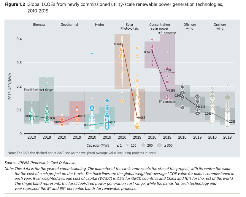 Para los años 2007-2021, los datos de la Base de datos de costos renovables de IRENA sugieren que en los próximos años, el LCOE promedio ponderado global podría caer a poco más de USD 50 por MWh en 2021. Sin embargo, esto dependerá de si los proyectos pueden cumplir con sus objetivos de puesta en marcha”.