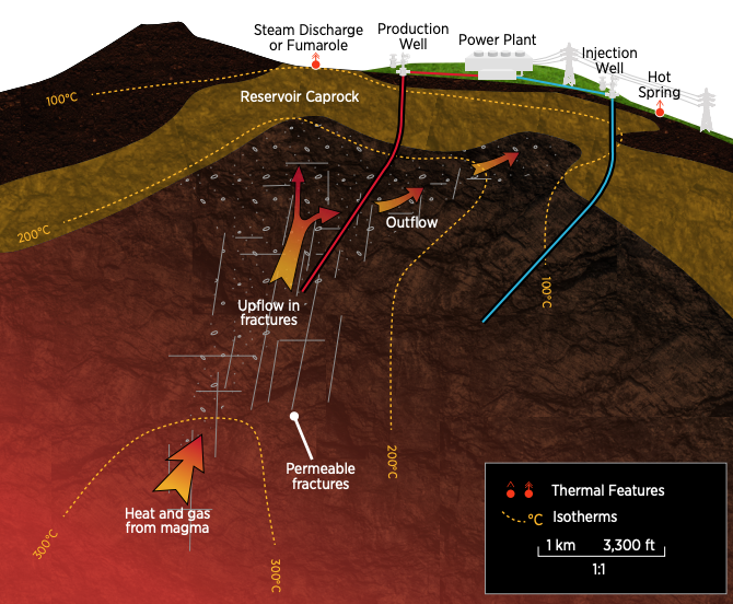 La geotermia implica la perforación de pozos profundos en áreas calientes para producir vapor directamente, lo que significa que la cadena de suministro se superpone significativamente con petróleo y gas. Tanto como el 50% del costo de la energía geotérmica proviene de la perforación, por lo que una caída en los precios del petróleo puede reducir los costos drásticamente. [Aquí compartió la siguiente imagen que muestra el modelo conceptual de recursos hidrotérmicos publicado en el informe GeoVision del DOE de EE. UU. Publicado en 2018].