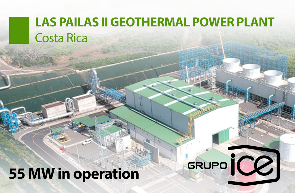 El Grupo ICE inauguró oficialmente la planta geotérmica Pailas II, de 55 MW, ubicada cerca del volcán Rincón de la Vieja, totalizando así el país con una capacidad geotérmica instalada de 262 MW.