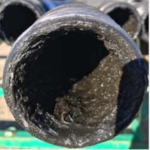 Figura 1: La inspección de la tubería extraída del pozo canadiense mostró depósitos de sólidos orgánicos e inorgánicos en la tubería sin revestimiento, mientras que la tubería revestida con IPC estaba mayormente libre de depósitos.