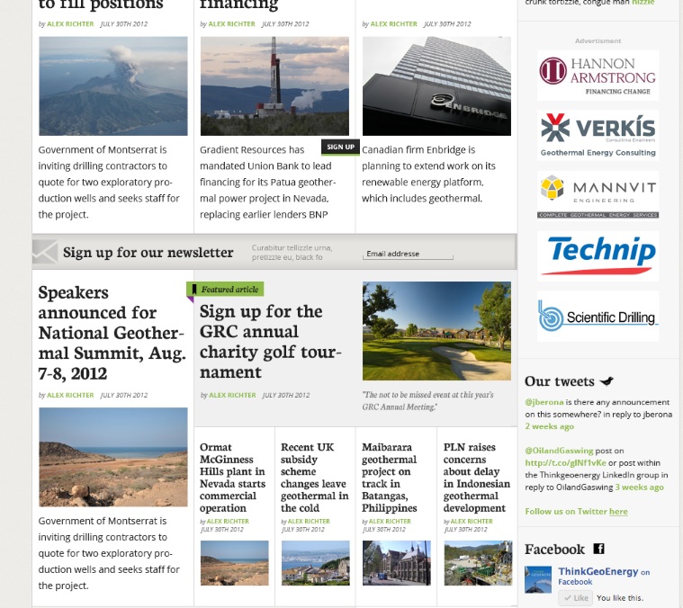 La nueva Web de ThinkGeoEnergy se puso en marcha ayer por la mañana. Aunque todavía quedan muchas aspectos por arreglar y adaptar, esperamos que os podáis hacer una idea de la nueva dirección que está tomando el nuevo proyecto.