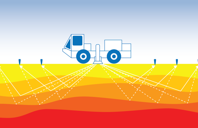 Picture: The vibrotrucks send sound waves into the ground, which are picked up by microphones. (source: Enerchange)
