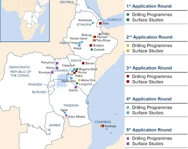 El Fondo de Mitigación de Riesgos Geotérmicos (GRMF) se estableció para financiar, facilitar y acelerar el desarrollo geotérmico en once países socios en la región del Rift de África Oriental. Está alojado y gestionado por la Comisión de la Unión Africana (AUC). El Ministerio Federal de Cooperación Económica y Desarrollo (BMZ) de Alemania proporciona fondos junto con el Fondo Fiduciario de Infraestructura UE-África (ITF de África de la UE) a través del Banco de Desarrollo de KfW (KfW) y el Departamento de Desarrollo Internacional del Reino Unido (DFID). GRMF se constituyó en el año 2012. Lleva a cabo una serie de rondas de solicitudes para identificar proyectos elegibles y financiables y determinar los niveles de financiamiento de proyectos adecuados. La quinta ronda de solicitudes finalizó en octubre de 2018. El programa GRMF tiene un volumen total de financiamiento de aproximadamente USD 115 millones, que puede incrementarse a discreción de los donantes.