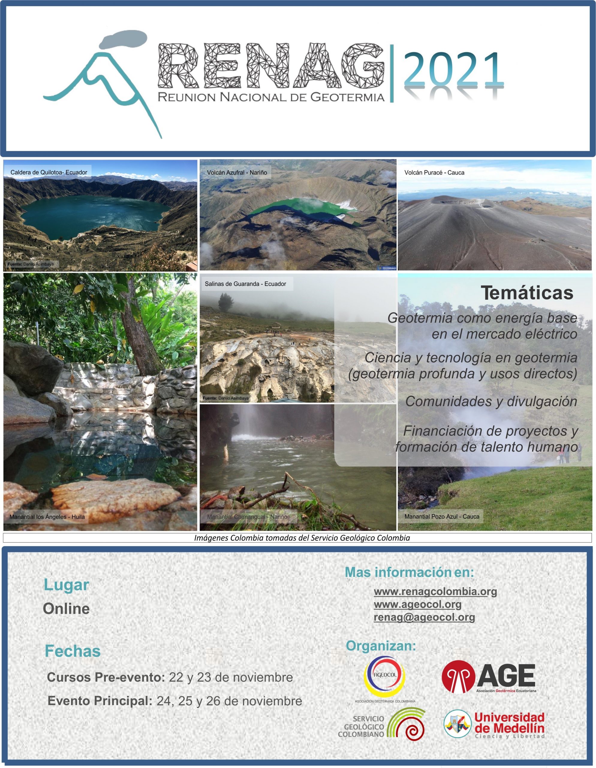 Este 22-26 de Noviembre se desarrollará la 5ta Reunión Nacional de Geotermia, RENAG 2021, desarrollado por la Asociación Geotérmica Colombiana (AGEOCOL) en colaboración con la Asociación Geotérmica Ecuatoriana (AGE).