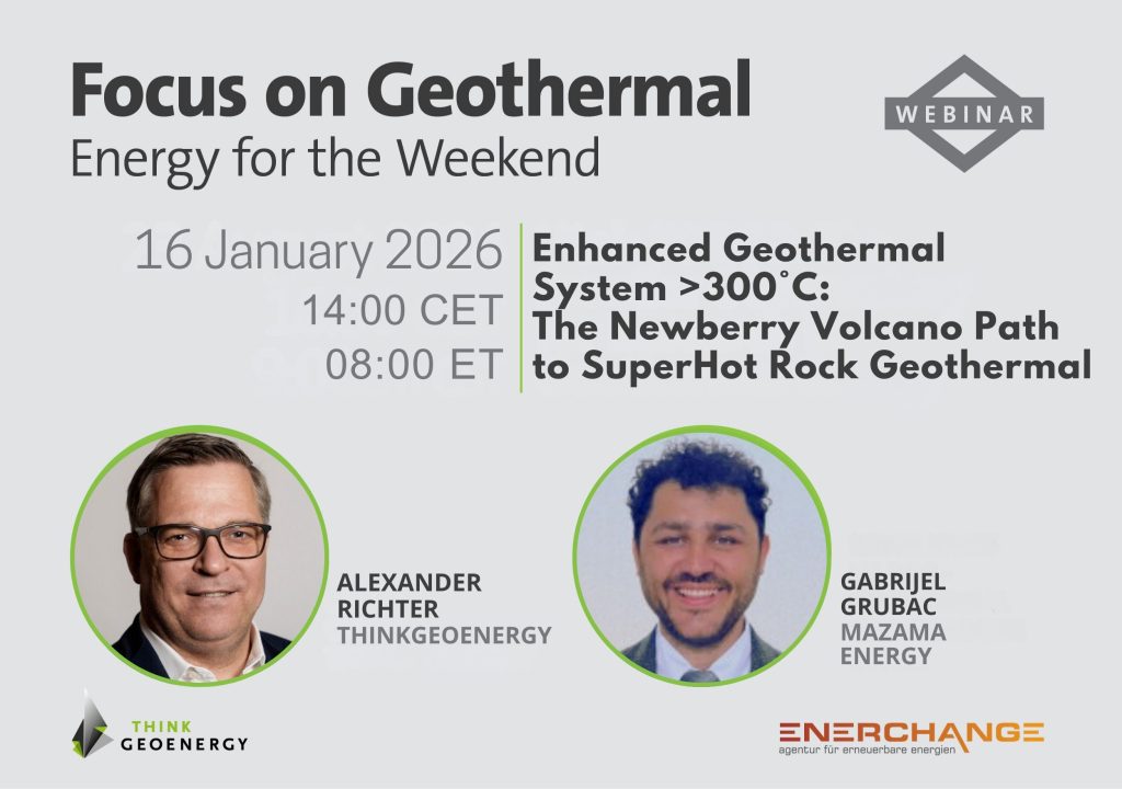 Como parte de la serie regular de seminarios web “Enfoque en Geotermia”, una colaboración entre Enerchange y ThinkGeoEnergy, nos complace presentar a Gabrijel Grubac, de Mazama Energy, en un seminario web sobre “Sistema Geotérmico Mejorado >300 °C: El camino del Volcán Newberry hacia la geotermia de rocas supercalientes”. Más detalles: