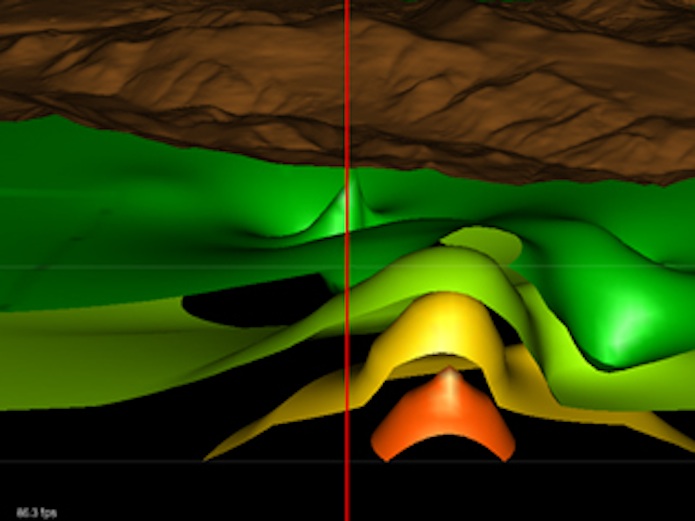 Virtual reality model of the Valles Caldera, NM, This view shows the layered temperature isotherms (source: UC Davis Student Geothermal Competition Team/graphic)