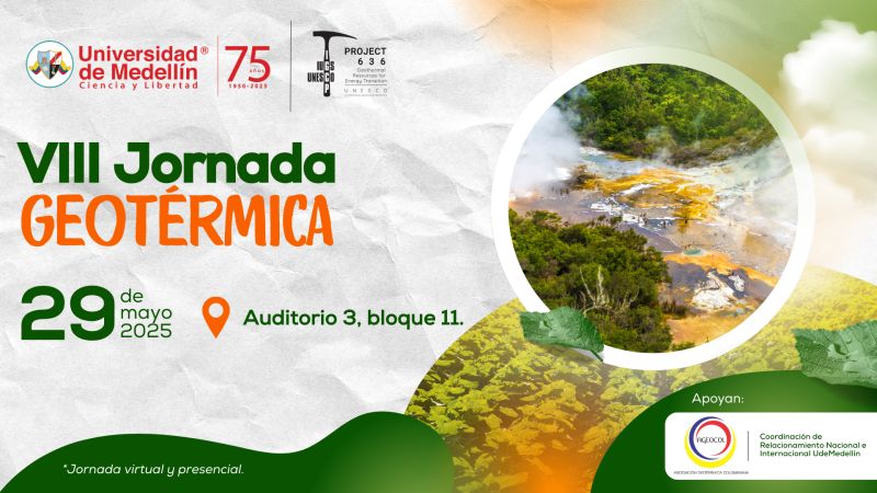 El próximo jueves 29 de mayo de 2025, la Universidad de Medellín será sede de la VIII Jornada Geotérmica, un evento académico organizado por el Proyecto UNESCO IGCP 636 – fase II, en colaboración con la Asociación Geotérmica Colombiana (AGEOCOL). El evento tendrá lugar en el Auditorio 3 del Bloque 11 y se desarrollará en modalidad híbrida (presencial y virtual).