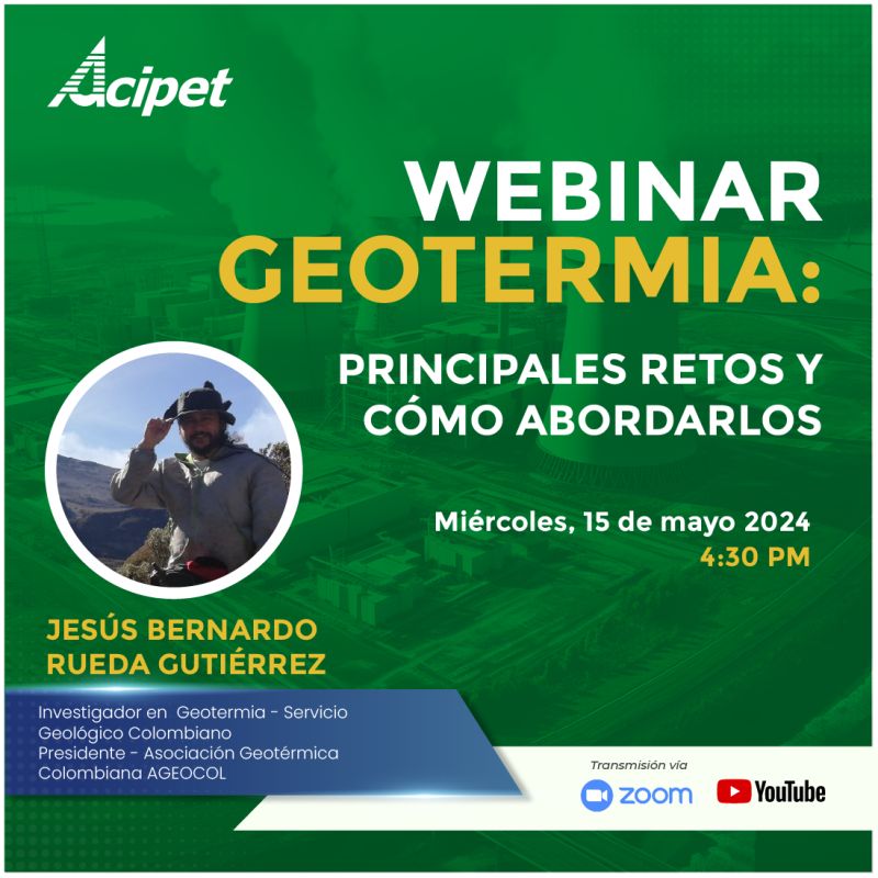 ACIPET organiza un webinar sobre Geotermia el 15 de mayo, con Jesús Bernardo Rueda Gutiérrez, Presidente de AGEOCOL. Únete para explorar desafíos y estrategias en energía geotérmica.