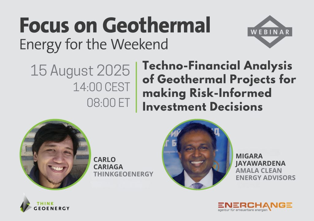 Como parte de la serie regular de seminarios web “Focus on Geothermal”, una colaboración entre Enerchange y ThinkGeoEnergy, nos complace presentar a Migara Jayawardena, de AMALA Clean Energy Advisors, en un seminario web sobre “Análisis técnico-financiero de proyectos geotérmicos para la toma de decisiones de inversión basadas en el riesgo”.