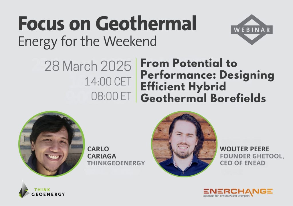 Como parte de la serie regular de seminarios web “Focus on Geothermal”, una colaboración entre Enerchange y ThinkGeoEnergy, nos complace presentar a Wouter Peere, de Enead y GHETool, en un seminario web sobre “Del Potencial al Rendimiento: Diseño de Campos de Perforación Geotérmica Híbridos Eficientes”.