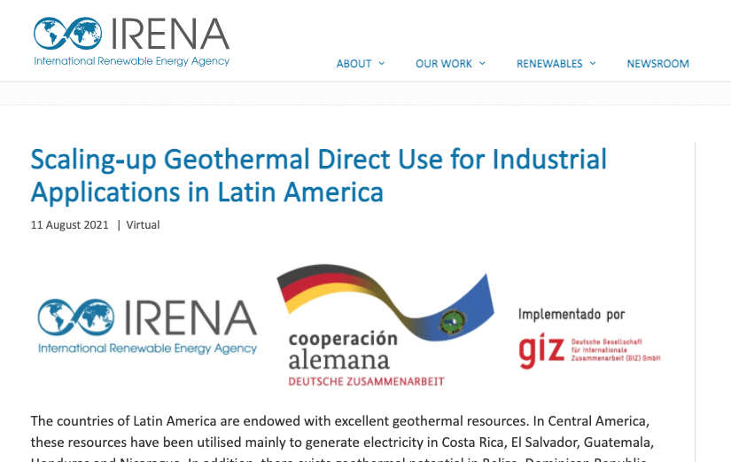 La Agencia Internacional de Energías Renovables (IRENA) y la Deutsche Gesellschaft für Internationale Zusammenarbeit (GIZ) GmbH, están co-organizando un webinar para Ampliar los usos directos de la geotermia para aplicaciones industriales, cuyo objetivo es resaltar los beneficios y las oportunidades para las aplicaciones industriales, agroalimentarias y de calefacción y refrigeración de la energía geotérmica para las partes clave interesadas en la región y destacar las experiencias regionales e internacionales.